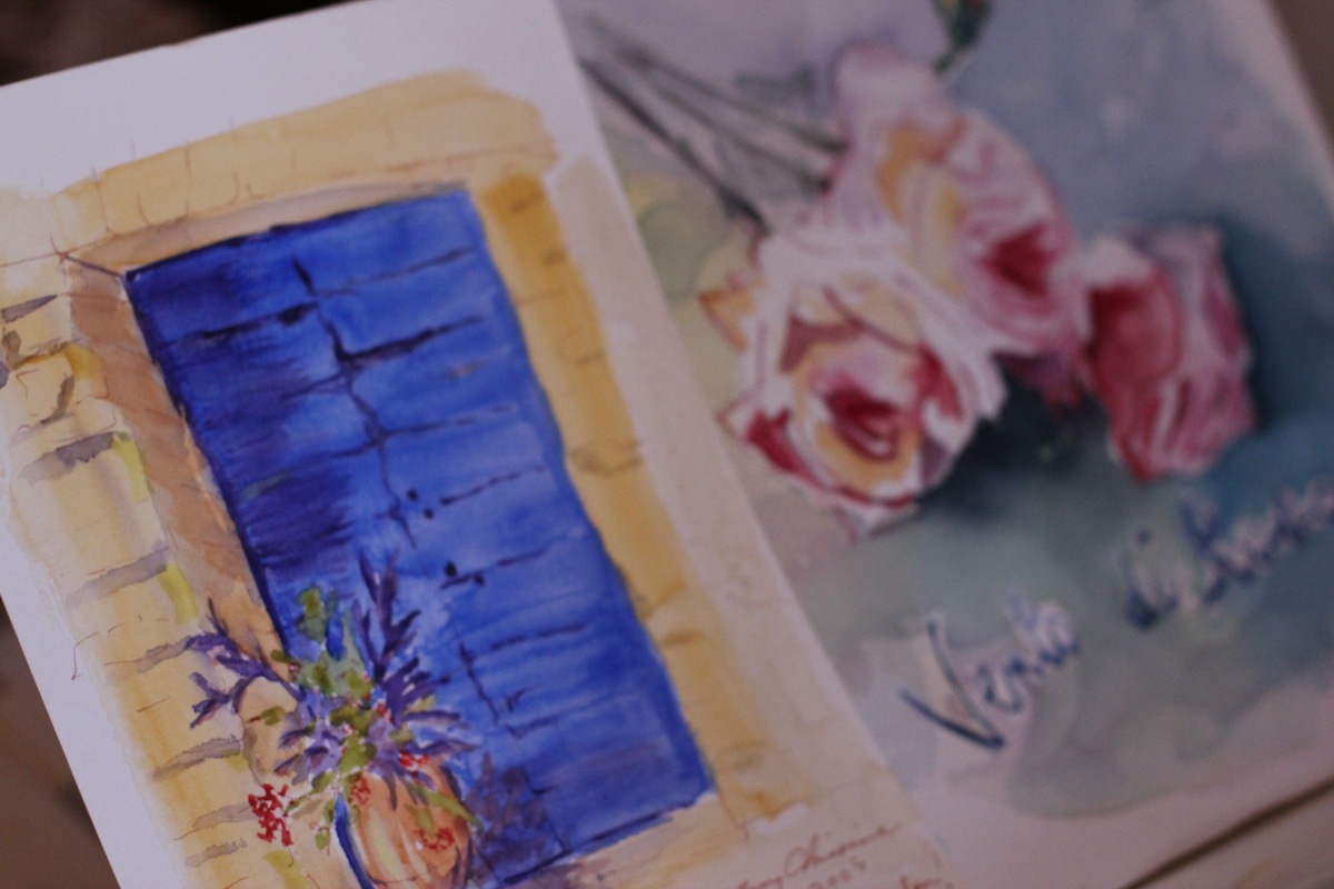 - The colours: the blue of the windows, the white of the cottage, the pink flowers, green lawn